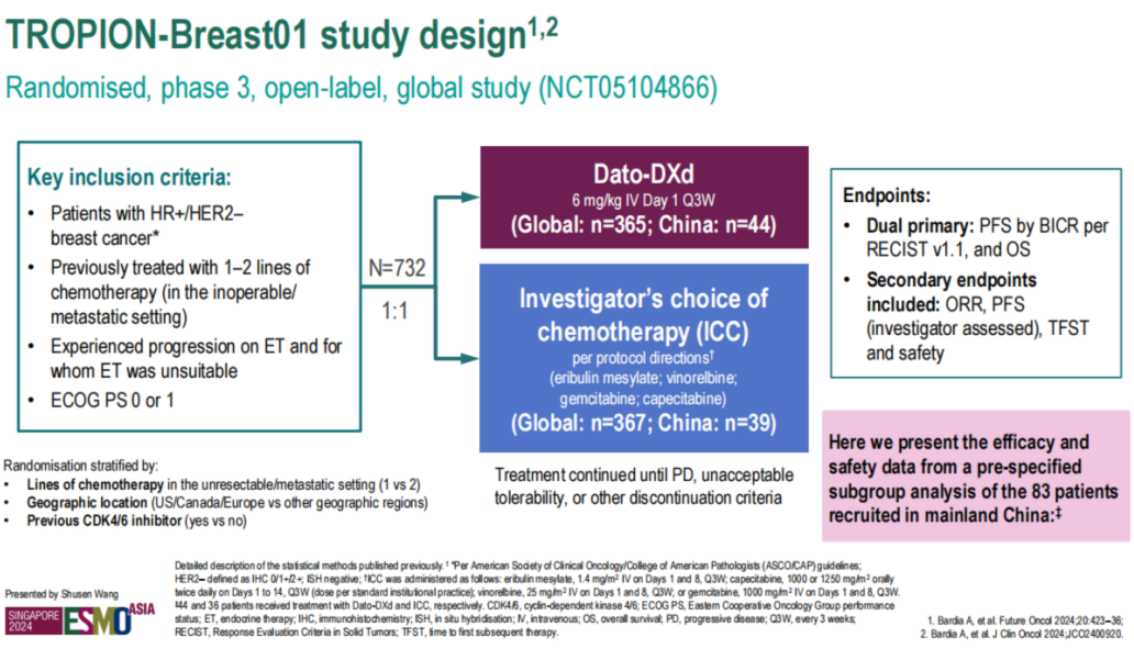 [10]、Qingyuan Zhang,Shunsen Wang,Zefei Jiang,et al.Datopotamab deruxtecan(Dato-DXd)vs chemotherapy(CT)in patients(pts)with pre-treated inoperable/metastatic hormone receptor-positive,HER2-negative(HR+/HER2–)breast cancer(BC):Results from TROPION-Breast01 China cohort[EB/OL].ESMO Asia 2024.Abstract 38MO.
