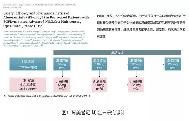 其I期临床试验是一项国际多中心的剂量爬坡试验,中国大陆、中国台湾和美国均有中心参与该试验,纳入了120例既往接受一代/二代EGFR靶向药治疗失败的T790M阳性的晚期非小细胞肺癌患者。第一阶段是剂量爬坡阶段,有26名患者参与,目的是探索副作用和最大耐受剂量(MTD)。第二阶段是剂量拓展阶段,94名患者参与,分别接受55mg每天一次、110mg每天一次以及220mg每天一次,三个不同剂量的药物治疗,初步研究疗效和寻找最合适的剂量。最终确认110mg剂量组能够兼顾疗效和安全性,试验结果显示客观缓解率(ORR)为50%,疾病控制率(DCR)为89.2%,中位无进展生存期(PFS)为9.6个月。常见不良反应为:肌酸激酶升高(20%)、腹泻(16.7%)、咳嗽(16.7%)、皮疹(15.8%)。常见的3/4级严重不良反应为:肌酸激酶升高、转氨酶升高。
